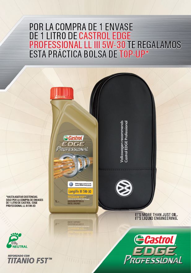 Por la compra de 1 envase de 1 litro de Castrol Edge Professional LL III 5W 30 te regalamos esta práctica bolsa de Top-Up*